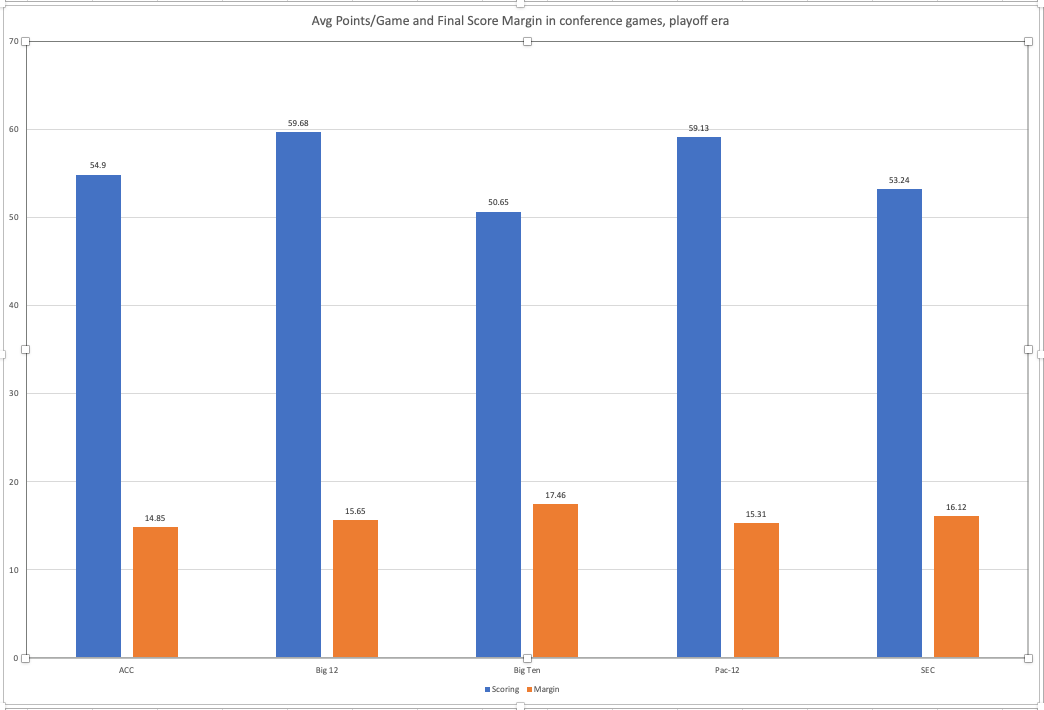 So, I dug deeper. I went back through the entire playoff era and looked at the percentage of conference games played that were decided by one possession, the average number of points scored in conference games, and the average margin in conference games.