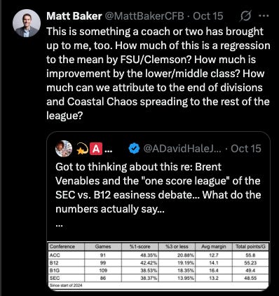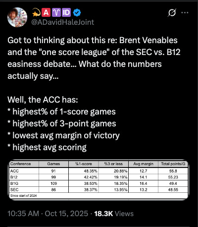Now, if we look at the trend lines, the Big 12 has lost some of its wild, Wild West luster in favor of the ACC, and, of course, RIP Pac-12 (and even more so, Pac-12 After Dark).