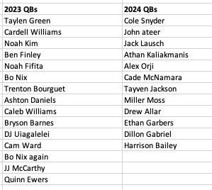 A BRIEF ASIDE: Let’s talk for a moment about Steve Belichick. I’ve heard often that he can’t be part of the issue at Carolina because he did a nice job improving Washington’s defense last year. But… Washington also moved from the Pac-12 to the Big Ten, which averaged a TD less per game. Washington’s offense moved slower under new coach Jedd Fisch than it had the year prior under Kalen DeBoer, the defense ran 37% fewer plays, and how about the list of QBs the Huskies faced in those two seasons…