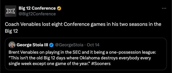 Brent Venables seemed to get under the skin of his former conference, the Big 12, this week when he suggested the SEC was a “one score league” in which teams were evenly matched, rather than the Big 12’s routine blowout wins for Oklahoma.