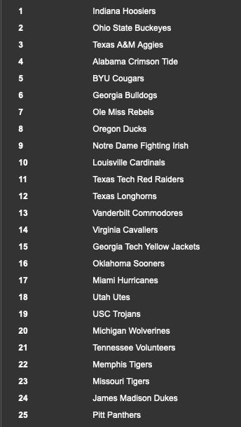I have Team B ranked No. 2 overall and Team A at No. 5. Honestly, I think that’s defensible, but the argument I hope to make with the blind resume is that BYU is much closer to Ohio State and Indiana than it is to, say, Texas Tech. That the AP has Oregon — seriously, look at who the Ducks have beaten — ahead of BYU is absurd. And if we want an idea of just how thoughtful the committee is going to be this year, BYU is the best team to watch. The Cougars have the No. 4 strength of record and are 19-2 over the past two seasons. If they’re behind the likes of Oregon, Ole Miss and Georgia — heck, even Alabama if we’re going to count the Florida State loss — then I’d say we’re in for a long month of propping up the SEC and Big Ten.
