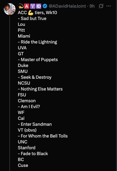 I did shake up my ACC tiers a good bit this week based on the fact that I think there are some solid but flawed teams, some teams that will give you a heart attack on a weekly basis, some teams that are too dangerous to overlook, and a whole bunch of meh. We turned to Metallica to offer our tiers.
