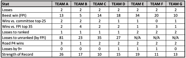 Well, Team B has the best win.5 It has a ranked loss and another top-25 loss by FPI. It has the most good wins. Team C has the best strength of record but also a bad loss. Team A has won on the road but has a bad loss. Team E hasn’t really beaten anyone good. Team F has some good wins but none against currently ranked teams.