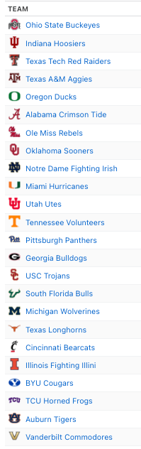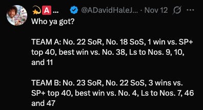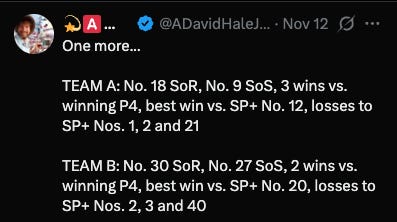 Team A is Tennessee, who’s beaten no one but doesn’t have a bad loss. Team B is Arizona State, who has some good wins — including vs. Texas Tech — and some ugly losses due in large part to an injured QB. But because Tennessee is a “ranked” win, that’s good news for Georgia and Alabama. Arizona State being on the outside hurts Utah.